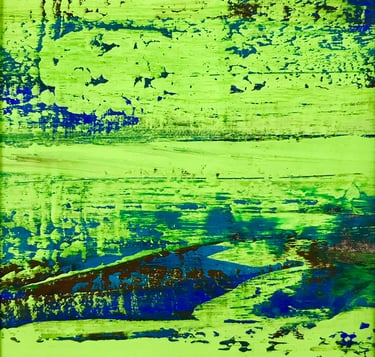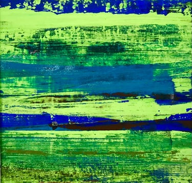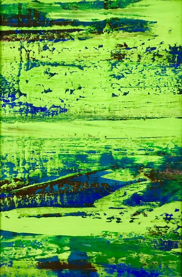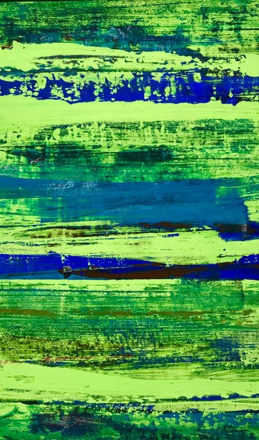 Imprinting colour from one painted surface to another, I extend my range of intentional mark-making as I pull pigments across paper and canvas and then lift them to another surface to create new intricacies of colour, detail, and spaciousness. Through this indirect subversion of conventional art practices to see the world anew, I celebrate the ephemeral and find a different centre, one that encourages a non-linear and non-perspectival focus.