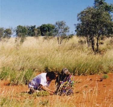 Photograph of Barbara Weir and her mother Minnie Pwerle collecting the grass seeds of Minnie's Dreaming taken in 1999 by Victoria King.