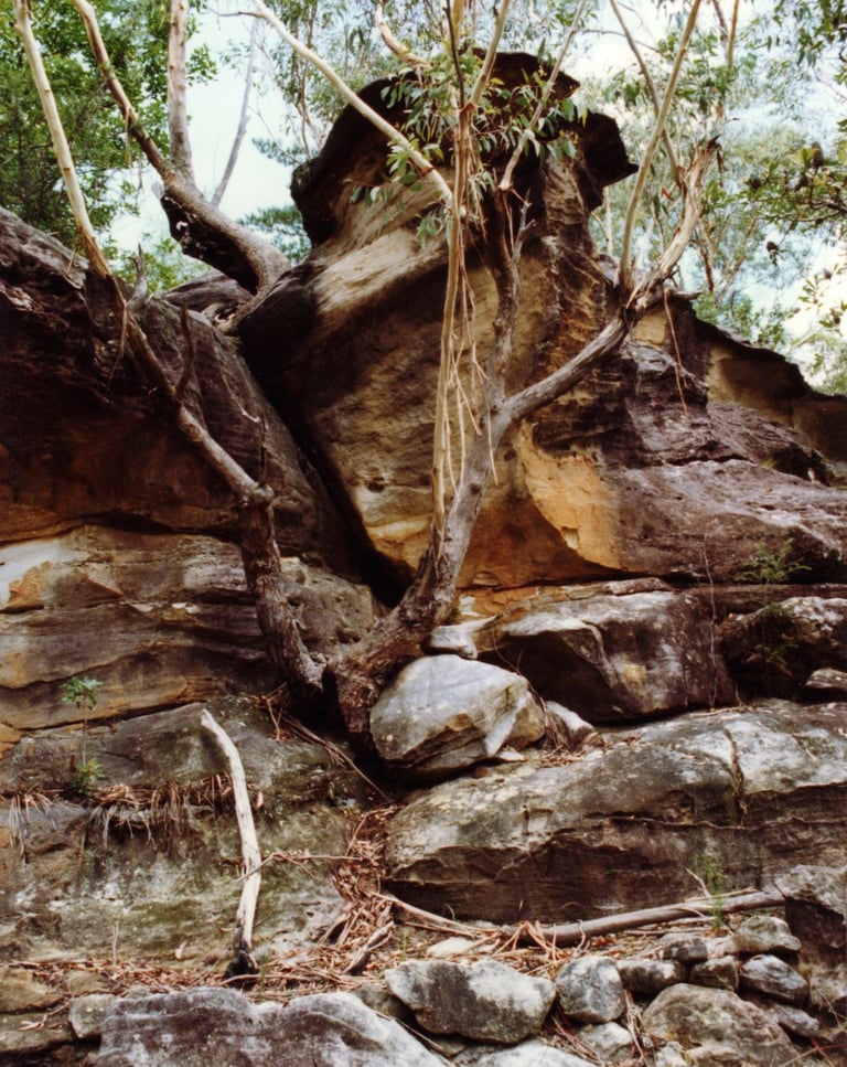 At the end of December 1993, I took a leave of absence from teaching and went to Australia for a holiday. I had impetuously fallen in love with an Australian whom I met at a 3-month Tibetan Buddhist retreat in France that summer. I never intended to stay, but he refused to live in England and I foolishly persisted in thinking I could change his mind. We lived for twelve years in a house I bought on three acres adjoining the Blue Mountains National Park. Exotic flowers were always in bloom in the garden, mist hung in the valleys like in a Japanese screen, and extraordinary wildlife animated the land with colour, song, and movement. I felt surrounded by an immense presence. This vast space and intimate diversity were what I had been trying to convey in my English painting for many years. Yet I felt homesick for my son and life in England, and found it difficult to paint the particularity of the stark beauty surrounding me. I had given up too much and felt no sense of belonging or sense of place. I was a gardener in a drought-ridden land where the activity seemed not only futile but inappropriate. In 1998, a chance meeting with Stolen Generation Aboriginal artist Barbara Weir resulted in her asking me to record her stories. I volunteered to transcribe her stories and those of twelve other Anmatyerre and Alyawarre women artists at the remote Aboriginal outstation of Utopia in the country's arid, red centre. Each time I returned home to my Blue Mountains' studio, I increasingly erased my work so as not to appropriate the appearance of Aboriginal artists' artworks. I often imprinted pigments from one surface to another in an attempt to find an appropriate gesture in an appropriated land. I also made and exhibited installations of sandstone, plaster, and rusted metal I found on my land. In 2000, I received a scholarship from the University of New South Wales in Sydney to research issues of place and displacement, and in 2005 was awarded a PhD for my thesis Art of Place and Displacement: Embodied Perception and the Haptic Ground.